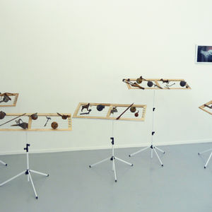 ou peut-être même mettre l’accent sur leur fonctionnalité initiale : tourner avec le vent. Le spectateur est invité à perturber cette installation. Que se passe-t-il ? Des chocs, des chutes ?« Le processus conçu pour conserver sur une courte durée sans altérer se transforme en mécanique d’altération de l’objet »